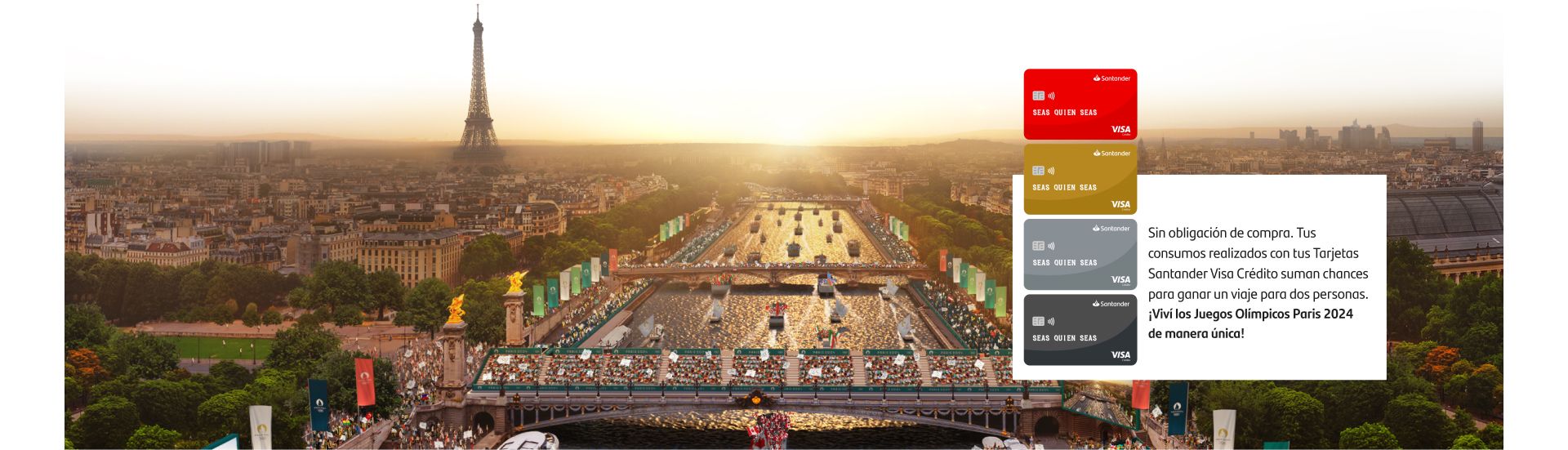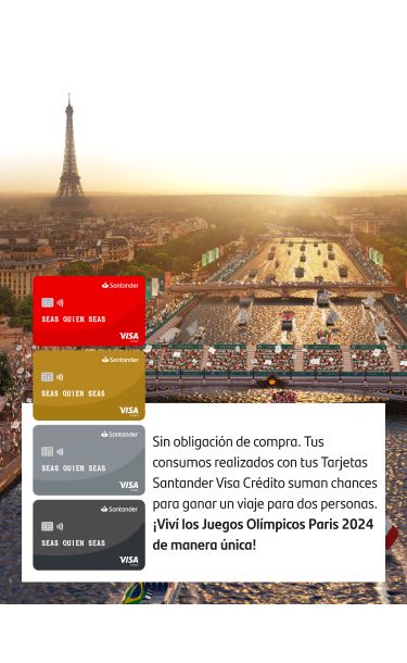 Bases y Condiciones de la promoción "A Catar sin sacrificios" ingresando aquí: Disponible para cartera de consumo y/o comercial. Vigencia del concurso del 22/03/2024 al 31/05/2024. Válido para mayores de 18 años. Excluye personas humanas con domicilio y/o productos en las provincias de Formosa, Jujuy, Neuquén, Salta, Mendoza, Rio Negro y Tierra del Fuego y personas jurídicas. Ej.: si comprás $10.000 con tarjeta de crébito, sumás 1 chance para el sorteo. El Premio es de 2 viajes para 2 personas para poder asistir a los Juegos Olímpicos a llevarse a cabo en Paris en agosto de 2024. Dichos premios se asignarán por cortesía de Visa International Service Association, con domicilio en Metro 1, 900 Metro Center Boulevard, Foster City, USA, según las fechas señaladas en las bases y condiciones. Las compras realizadas bajo el "Cuota Simple" participan de la promoción. Para los consumos realizados en dólares, se tomará el tipo de cambio oficial del Banco Nación del día de compra en el caso de los consumos con tarjeta de débito. Para los consumos con tarjeta de crédito el tipo de cambio que se utilizará será el día del pago del resumen. En el caso que los Consumos en dólares o, el pago se realice durante los fines de semana y días no hábiles tomará la cotización del viernes inmediato anterior.