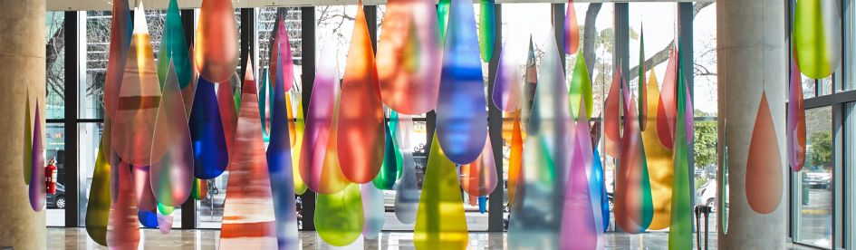 En Intemperie propone la estimulación visual dentro del espacio arquitectónico, tanto mediante la alteración cromática –a partir de formas dinámicas que dominan los muros vidriados- como de objetos tridimensionales colgantes, en contigüidad, que generan un ambiente inesperado. Permite múltiples asociaciones subjetivas desde lo orgánico a lo ficcional. Puede percibirse desde un afuera y un adentro, desde la pasividad exterior urbana o la activa inmersión en el recorrido. En ambas situaciones, el tránsito del exterior al interior del espacio arquitectónico descubre la totalidad de la obra, pero también cobra validez el encuentro fragmentado, los puntos de vista oblicuos, la mirada lejana. Así, predomina la idea de asimilación como percepción del sujeto en conexión con el entorno de formas implantadas. En el tránsito del público se construye la idea del tiempo: la percepción se sostiene en la imposibilidad de percibir dos formas a la vez.